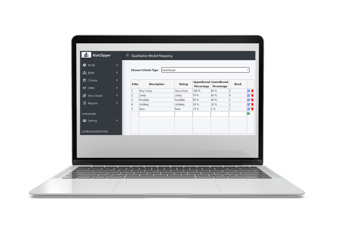 The system is not restrictive to a defined set of likelihood or consequence criteria. Both criteria and the corresponding scale description are aligned to organizational requirement. Note that though assessor may only see rating, the actual computation is based on the percentage assigned. This design is intentional so that equidistance between scales does not become a restriction to how Organization perceives from a quantitative perspective.