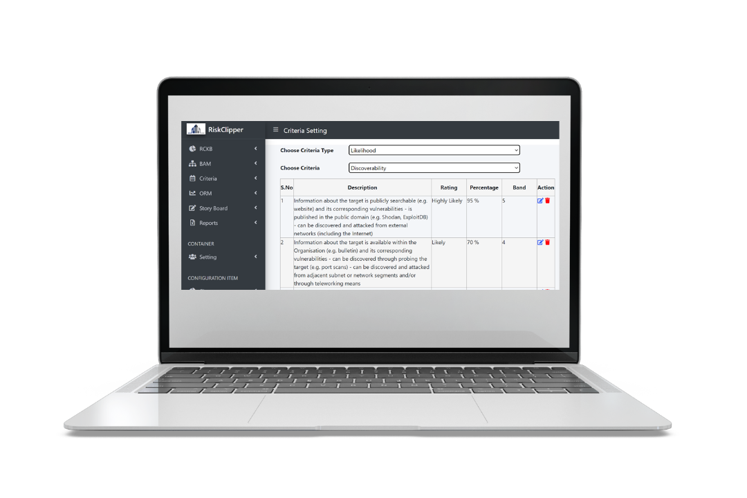As part of all risk management requirement, criteria for risk acceptance as well as criteria for performing risk assessment shall be defined. This module allows criteria to be defined in RiskClipper™ G7.